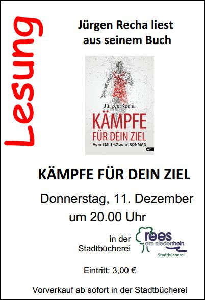 Vor einem Monat hatten wir das Buch "Kämpfe für Dein Ziel" vorgestellt. Hier nun der Flyer (PDF) zur Lesung in der Stadtbücherei in Rees.